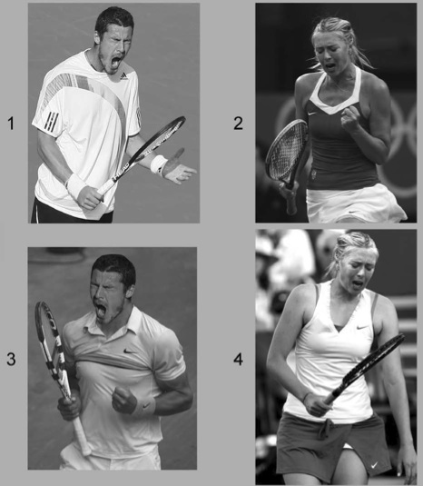 Examples of original images of players (1) losing or (2) winning a point. The same faces combined with incongruent-valence bodies such as (3) a losing face on a winning body and (4) a winning face on a losing body. [All photos credited to a.s.a.p. Creative/Reuters]